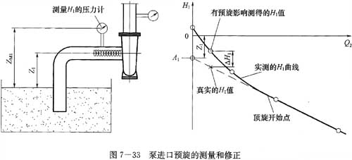 化工泵的叶轮旋转,影响叶轮前吸入管路中的液体也旋转,即产生预旋,如图7-33所示。预旋在大流量时很小,几乎测不出来,小流量时较强。预旋使管路外周的压力增高.由此测量的泵进口压力偏高,从而降低了泵的扬程,并可能使泵的流量扬程曲线出现驼峰。这种扬程下降和驼峰是一种假象,应予修正。其修正方法如下:选择规定的进口测量截面到上游较远处确认没有预旋影响的另一位置(如泵吸水池)之问这段管路,测试并做出兰段管路水力损失和流量的关系曲线H1=f(Q),因为水力损失和流量的平方成比例,即H1=KQ2。用预旋影响甚微的大流量点的流量Q求出K值(K=H1/Q2)。然后用此K值向最小流量侧计算出不同流量的H。值,画出计算的H1=f(Q)曲线。两曲线间的差值即是修正值,应将该修正值加在原测试中对应流量点的扬程上。